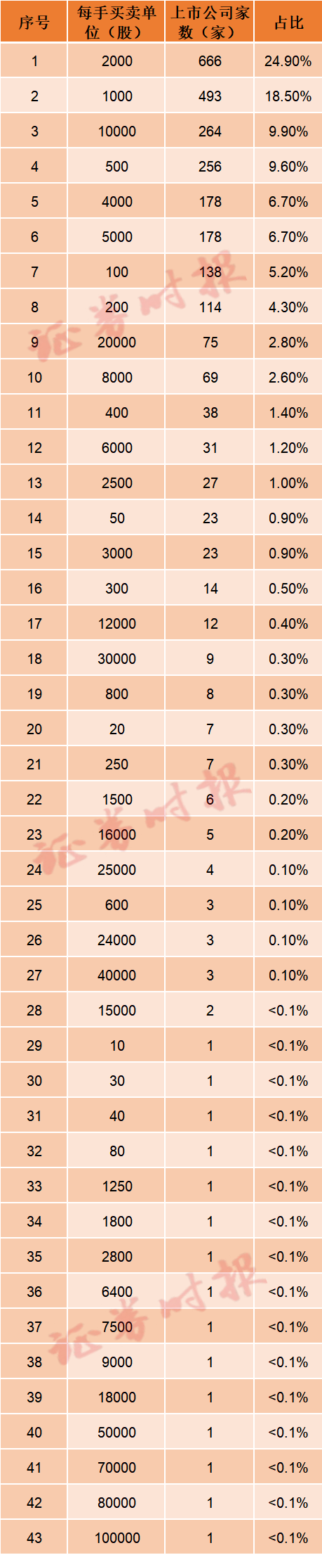 證券時報記者通過Wind數(shù)據(jù)整理發(fā)現(xiàn),港股市場的每手買賣單位多達43個。每手從10股到10萬股不等,其中每手2000股的公司數(shù)量最多,達到666家,占比達24.9%;每手1000股的公司數(shù)量也達到493家,占比18.5%。其余數(shù)量較多的則分別是每手10000股、500股、4000股、5000股以及100股和200股。