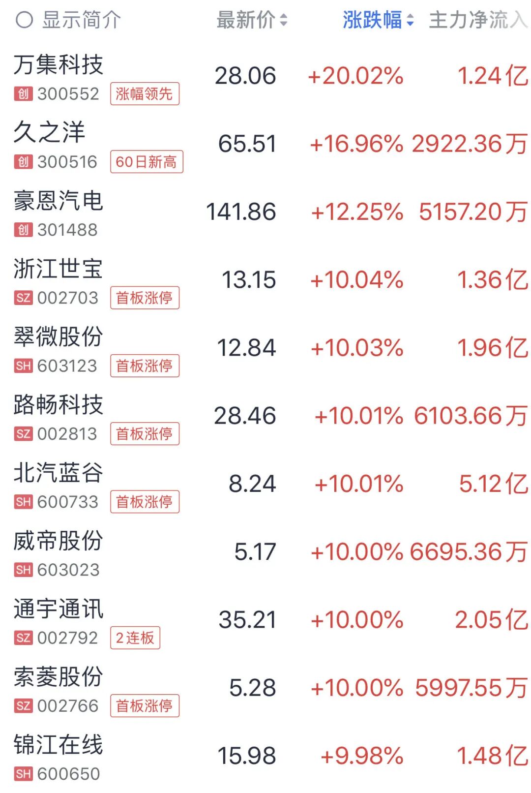 無人駕駛概念盤中表現(xiàn)活躍,其中,萬集科技開盤1分鐘20%漲停,久之洋漲近17%,浙江世寶A股、路暢科技、北汽藍谷、威帝股份等多股漲停。