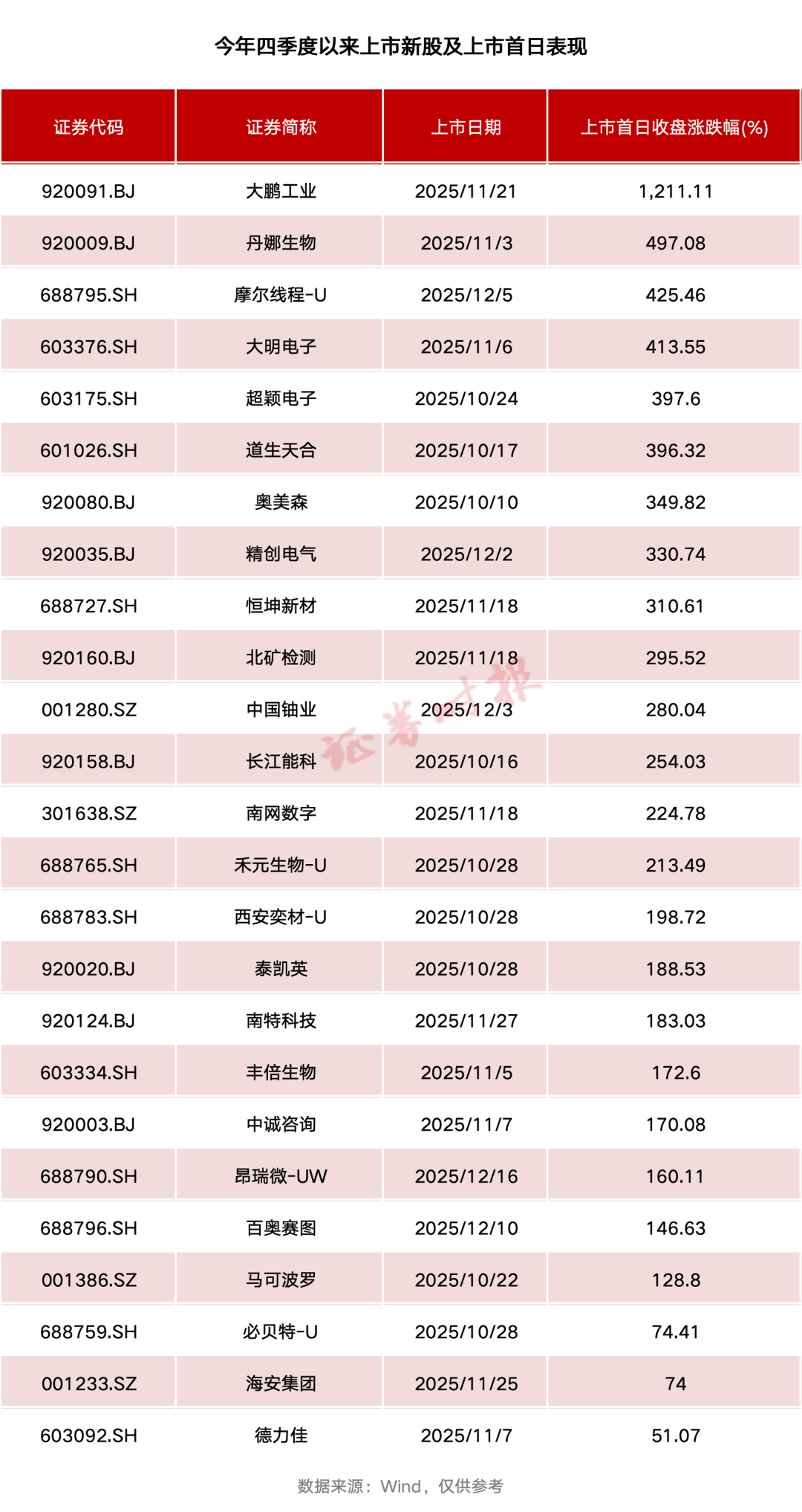 具體來看,今年四季度以來,大鵬工業(yè)、丹娜生物、摩爾線程-U、大明電子、超穎電子、道生天合、奧美森、精創(chuàng)電氣、恒坤新材上市首日收盤漲幅均超過300%。這里面,大鵬工業(yè)上市首日收盤漲幅達(dá)1211.11%,成為2025年以來上市首日收盤漲幅最大的新股。