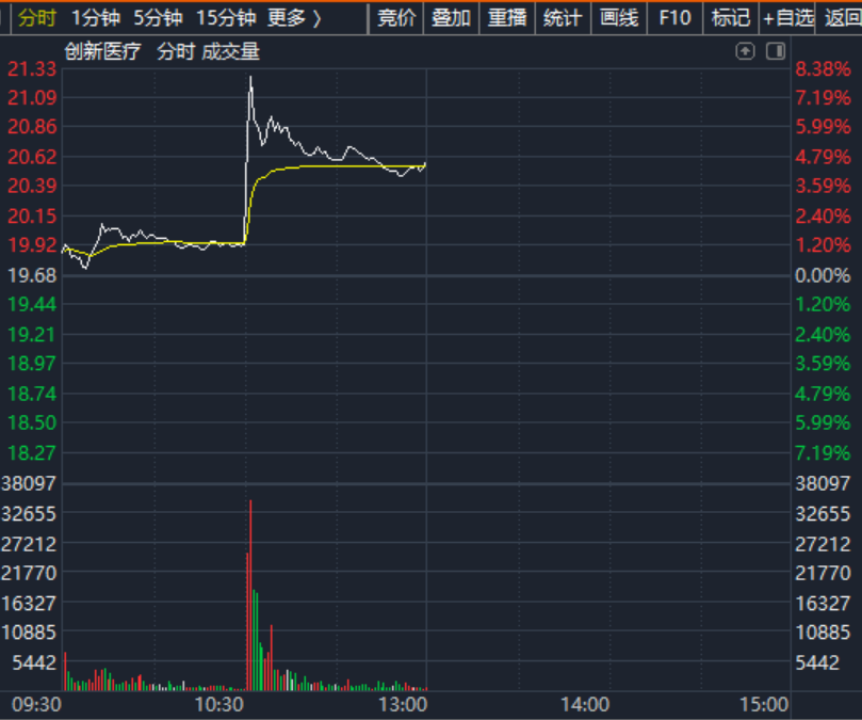 二級(jí)市場(chǎng)上,受上述消息刺激,腦機(jī)接口概念股盤(pán)中直線拉升,創(chuàng)新醫(yī)療一度漲超8%,倍益康一度漲超6%,三博腦科、愛(ài)朋醫(yī)療、翔宇醫(yī)療等紛紛異動(dòng)。