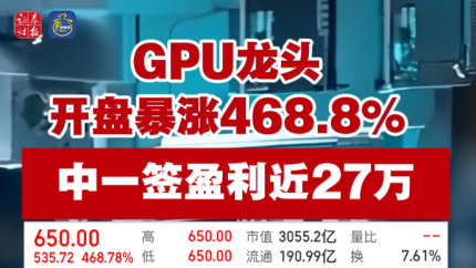 GPU龍頭開盤暴漲468.8% 中一簽盈利近27萬
