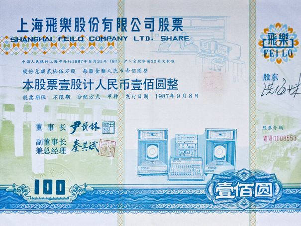 1984年,飛樂(lè)音響向社會(huì)公開(kāi)發(fā)行股票融資,轟動(dòng)國(guó)內(nèi)外。1986年9月,飛樂(lè)音響實(shí)現(xiàn)了柜臺(tái)交易流通。當(dāng)年11月14日,鄧小平將一張飛樂(lè)音響股票贈(zèng)送給來(lái)訪的時(shí)任美國(guó)紐約證券交易所主席約翰·凡爾霖先生?!帮w樂(lè)音響”作為“新中國(guó)第一股”,永遠(yuǎn)記載在中國(guó)金融、經(jīng)濟(jì)發(fā)展的史冊(cè)上。圖為1987年9月8日發(fā)行的上海飛樂(lè)股份有限公司股票?!?/p>