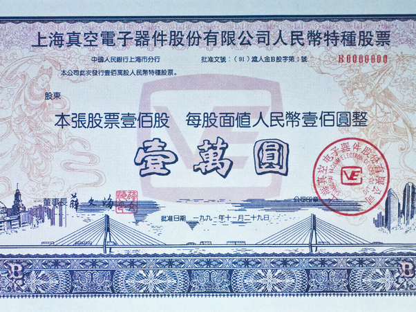1991年底,人民幣特種股票(B股)試點(diǎn)推出,資本市場(chǎng)對(duì)外開(kāi)放邁出第一步。圖為1991年11月29日發(fā)行的上海真空電子器件股份有限公司人民幣特種股票?!?/p>