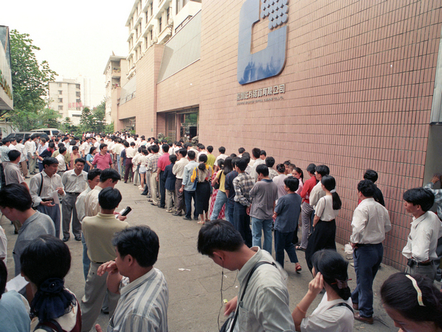 90年代初,股民蜂擁購(gòu)買股票的火爆場(chǎng)面?!?/p>