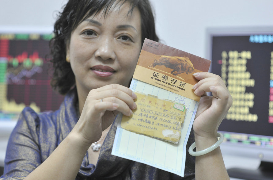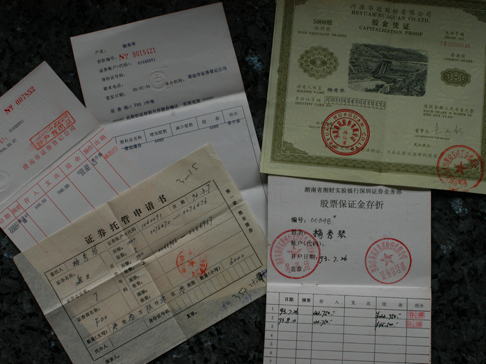 2008年9月24日,圖為中國(guó)第一批股民手持最早的股東代碼卡與股票交易記錄。
