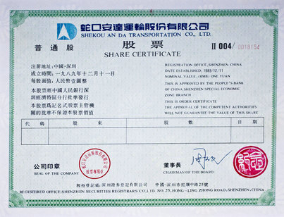 1989年12月11日發(fā)行的蛇口安達(dá)運(yùn)輸股份有限公司股票。
