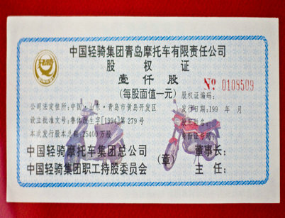 1994年中國(guó)輕騎集團(tuán)青島摩托車有限責(zé)任公司股權(quán)證。