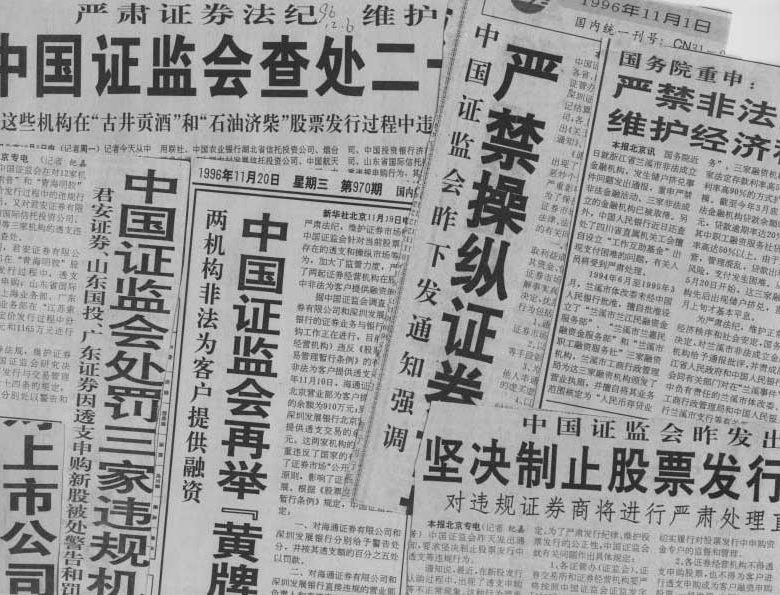 1996年,市場(chǎng)迎來(lái)一波牛市。從1996年4月1日至12月9日,上證指數(shù)暴漲120%,深成指暴漲340%。幾個(gè)月來(lái)新增投資者開(kāi)戶數(shù)800多萬(wàn),總數(shù)超過(guò)2100萬(wàn)。10月起,管理開(kāi)始變調(diào),連發(fā)了后來(lái)被稱為“十二道金牌”的規(guī)定,主要包括關(guān)于規(guī)范上市公司行為若干問(wèn)題的通知》等。此為股民在深圳證券結(jié)算有限公司外排隊(duì)等待開(kāi)戶的場(chǎng)面。