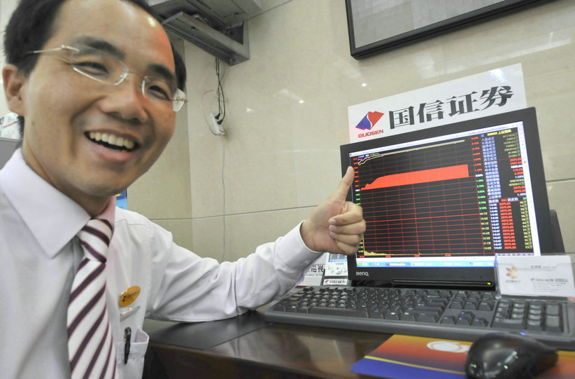 2008年9月19日,交易印花稅下調(diào)股市大漲,國(guó)信證券營(yíng)業(yè)部?jī)?nèi)的工作人員高興地對(duì)著大盤(pán)豎起了大拇指。