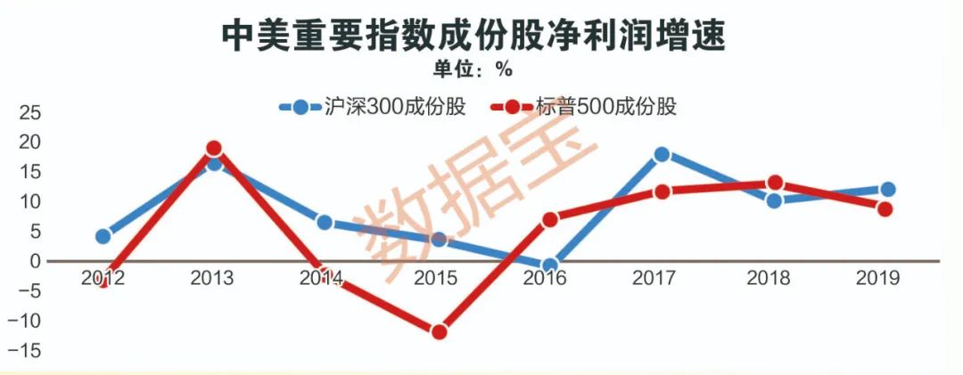 數(shù)據(jù)寶統(tǒng)計(jì),2011年以來滬深300指數(shù)凈利潤年復(fù)合增速8.58%,比同期標(biāo)普500指數(shù)(4.82%)高出近80%。除2016年小幅下跌外,其余年份滬深300指數(shù)凈利潤均保持了穩(wěn)定正增長;相比之下,標(biāo)普500指數(shù)凈利潤多次出現(xiàn)負(fù)增長,年度最大跌幅超過10%,業(yè)績波幅更大。