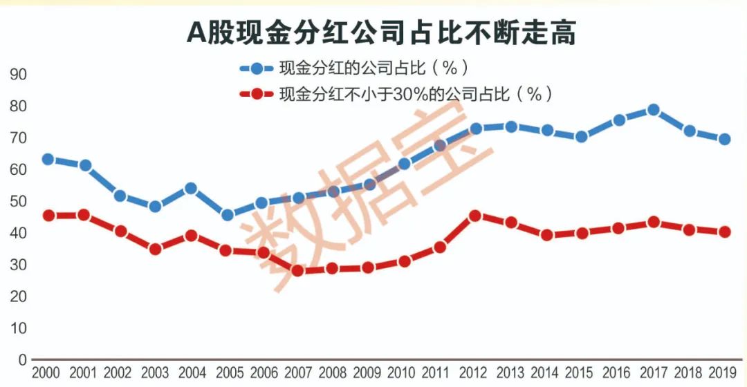 數(shù)據(jù)寶統(tǒng)計(jì),2019年實(shí)施現(xiàn)金分紅的上市公司數(shù)量達(dá)2629家,占年末上市公司總數(shù)的70%,較10年前提升了近10個(gè)百分點(diǎn)。其中,1520家公司現(xiàn)金分紅占凈利潤比例不小于30%,大手筆分紅漸成常態(tài)。