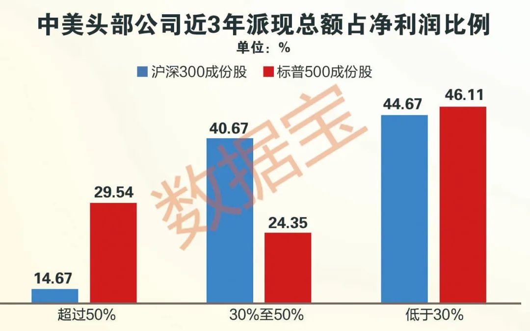 從區(qū)間分布來看,近3年股利支付率超過50%的公司占滬深300指數(shù)成份公司總數(shù)的14.67%;標(biāo)普500成份股中,這一比例接近三成,為前者的兩倍。美股上市公司中高比例分紅股數(shù)量大幅高于中國。