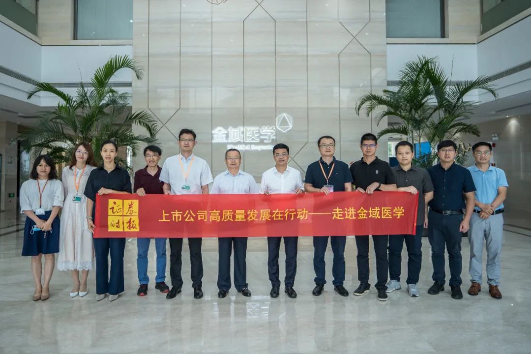 金域醫(yī)學(xué)董事長兼首席執(zhí)行官梁耀銘(右六)、證券時(shí)報(bào)副總編輯成孝海(左六)與采訪團(tuán)合影。楊挺/攝
